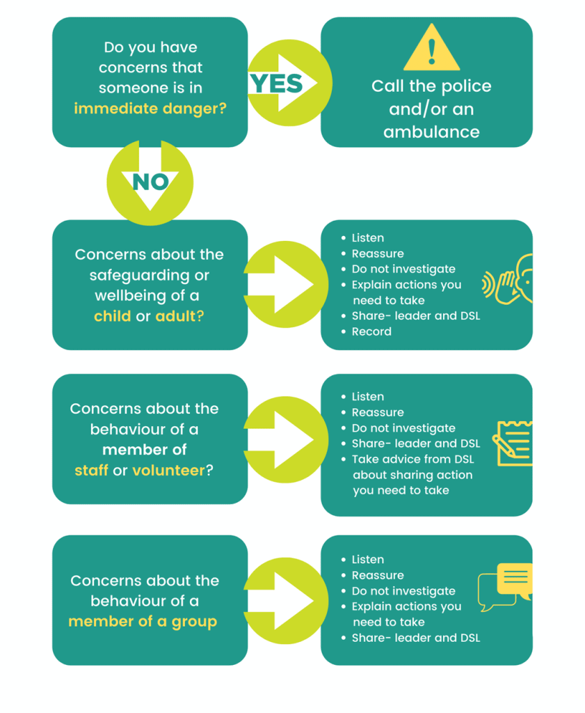 If you have any concerns which relate to the person that you should be reporting safeguarding concerns to, please speak with the person above them. For example, if you are a volunteer with the YAC and have concerns about a branch leader, speak to the DSL. If your concern relates to one of the DSLs, please speak to the other DSL or the safeguarding trustee champion. Please see refer to Section 5. for detailed information on whistleblowing and escalation.